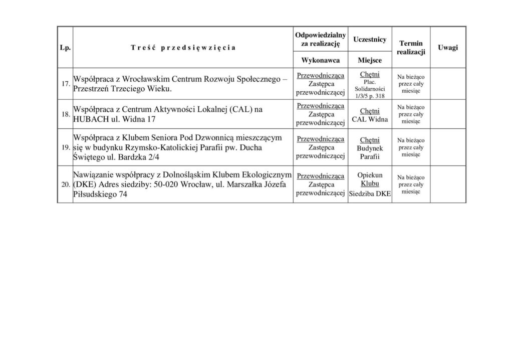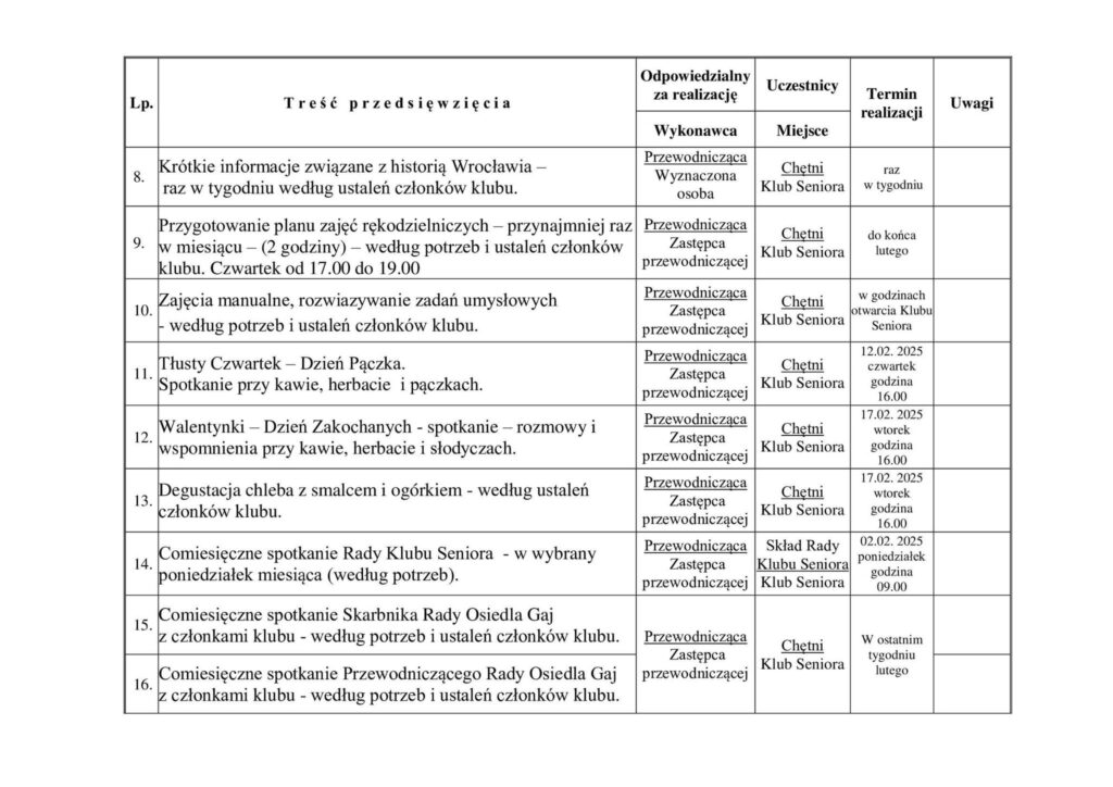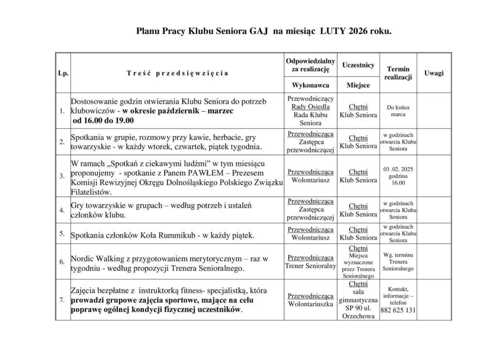 Plan Pracy Klubu Seniora na Gaju na miesiąc Luty 2026